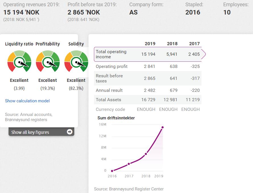 Koko vuoden osalta kasvua tuli 35 %. EPS kasvoi 45 % viimevuodesta ja oli NOK 0,67. Korkeat marginaalit kertovat hyvästä hinnoitteluvoimasta. Voimakkaasta (osakkeen hinnan ja liikevaihdon) kasvusta huolimatta yhtiö ei ole vieläkään kertoimilla pilattu. Tälle vuodelle olisi P/E 11, EV/EBITDA 3,1x ja EV/EBIT 4,6x. Velkaa ei yhtiöllä ole, mutta käteistä rahaa on NOK 370m
