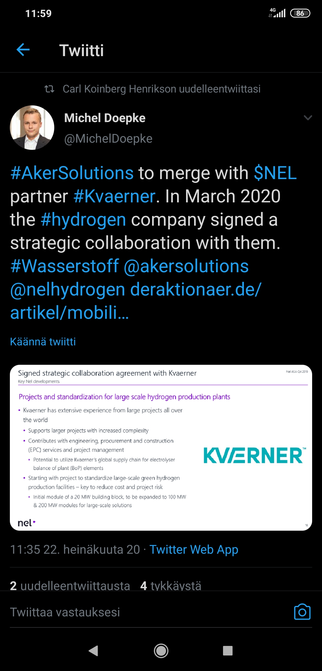 Eiköhän Nel ota isompaakin loikkaa kunhan alkaa olla “oikeasti” vetyautoja liikenteessä eli jo olemassa olevien (Hyundai Tucson & Nexo, Toyota Mirai, Honda Clarity) lisäksi näitä Nikola-Workhorse -akselin. Käsittääkseni Workhorse on jo jollain tasolla aloittanut toimituksia USPS:lle, ja UPS on jo jonkin aikaa käyttänyt, tosin taitavat tankata omissa tiloissaan?