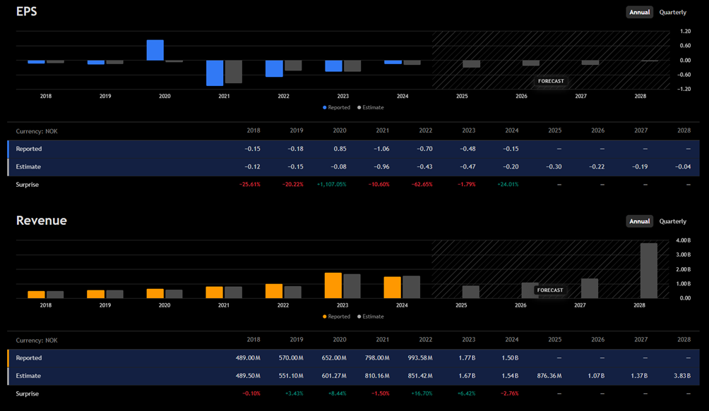 Niiden mukaan korpivaellus jatkuisi aina vuoteen 2028 saakka, jolloin liikevaihto “räjähtäisi” aiempaan nähden. Toki tuokaan ei ennusteilla vielä riittäisi nollatulokseen. Mutta onpa vuodesta 2025 tulossa todella heikko - eli odotukset ovat samalla erittäin alhaiset.