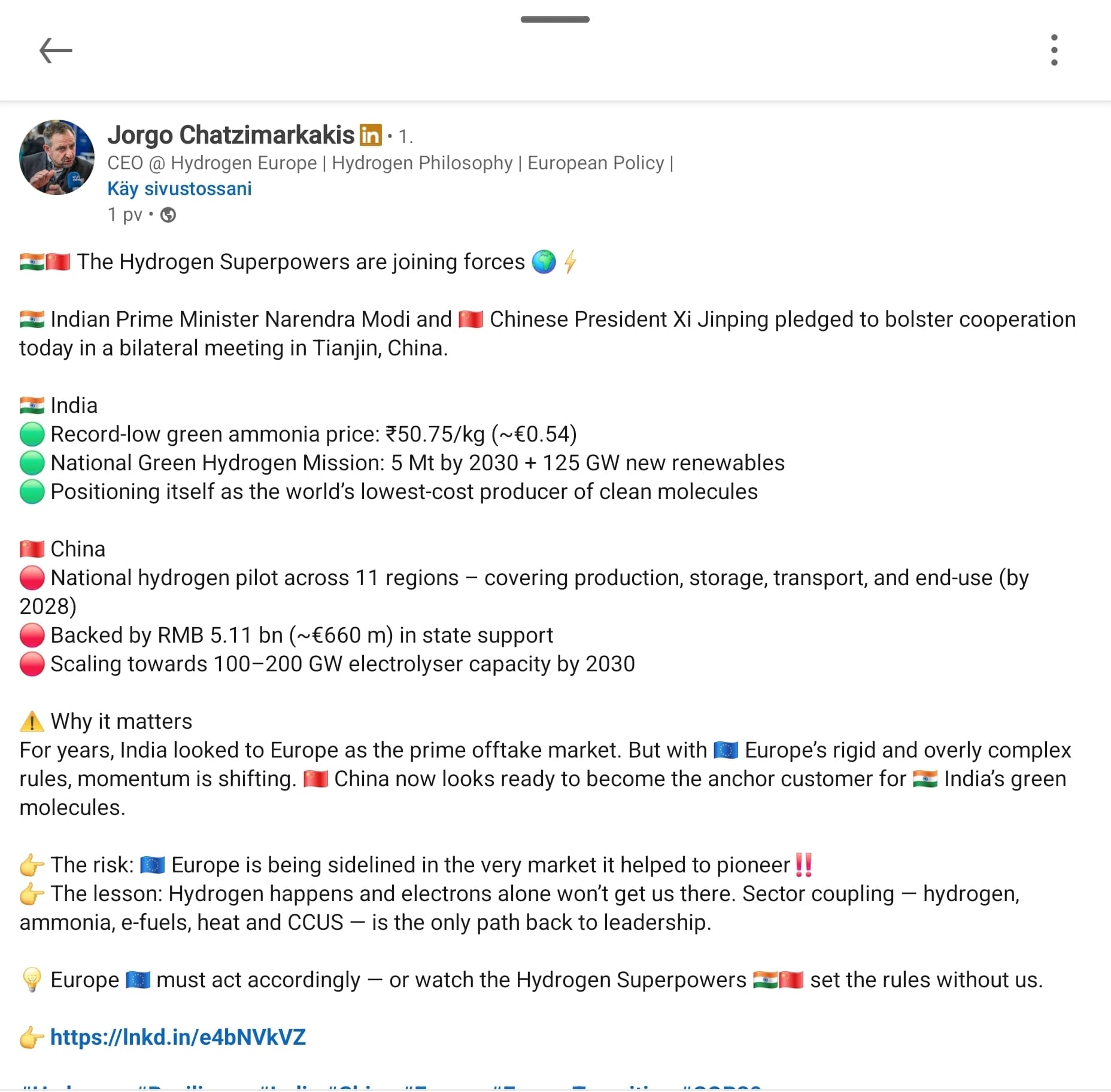 En tässä ala hehkuttaa mitään, mutta kyllä ylläoleva viesti tarkoittaa sitä, että jonkunlainen murros kysynnässä on tapahtumassa. H2Fuelin deali oli yli 50 miljoonaa taalaa. Tämä GreenH:n deali on vähintään samaa luokkaa eli yli 50 miljoonaa taalaa.