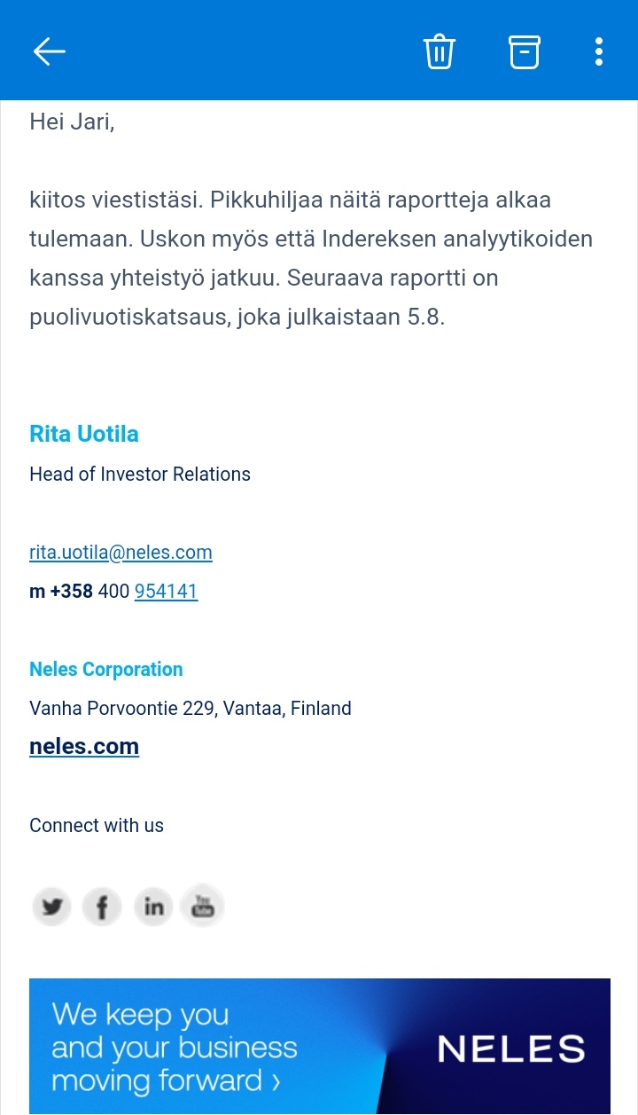 Selailin Neles Oyj sivuja ja osui silmiin kolmanneksi alin rivi: