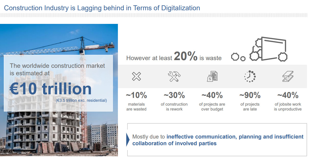 The problems in the construction industry are very well known and these will hardly come as a surprise. Digitalization has taken leaps forward in recent decades, but there is still a long way to go. In addition, a new challenge is the carbon footprint of construction and its reduction.