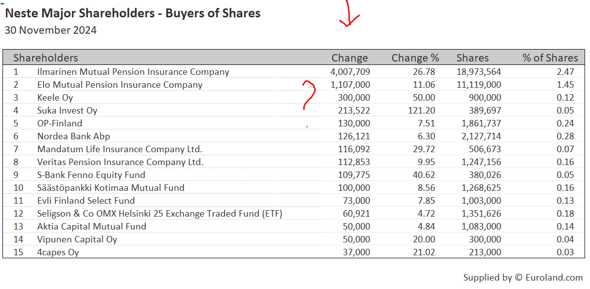 Did you notice Anttonen Keele Oy from the list of top buyers? It bought 300,000 shares in November and now owns 900,000. ST1 bought 2.2 million shares in November. So Anttonen already has over three million shares. Over 40 million has been invested in Neste.