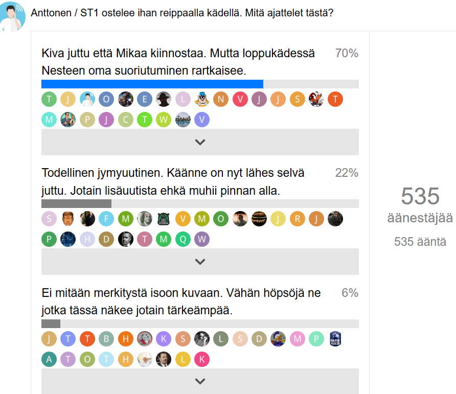 I am fully aware of Anttonen’s speech and comments based on media information (Kauppalehti, Talouselämä, Yle, Hesari), but the justifications mentioned in those articles (especially Talouselämä) certainly leave something to be desired. And actually, now one can only wonder even more about Anttonen’s motives for buying Neste ![]()