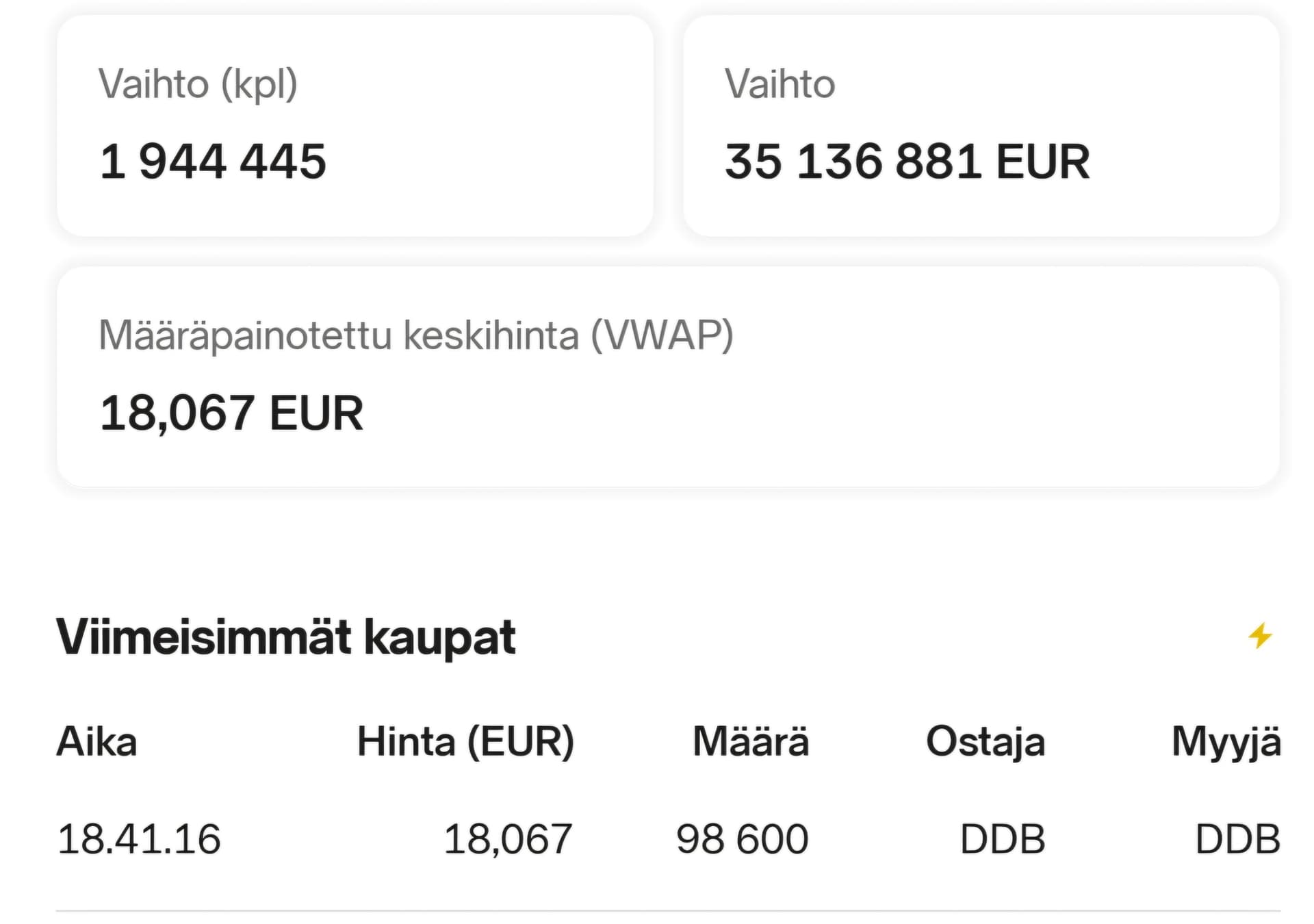 Loppuhuutarin jälkeen vielä vajaan 1,8M euron kauppa, jossa vaihtui 98,6k osaketta 18.067 eur kappalehintaan. Mielenkiintoinen ajoitus…