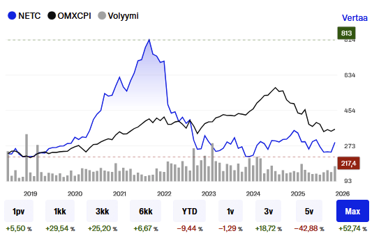 Tänään Netcompanyltä tuli Q3-luvut. 20 säännöllä kova 22 (org kasvu 8 % ja oik. EBITA 14). SDC:stä selvät kulusynergiat. Lisäksi ohjeistuksen tarkennus/kavennus. Liikevaihto ylitti hieman konsensuksen odotukset ja oik. orgaaninen EBITDA ylitti 6 % konsensuksen odotukset. Markkinat vaikuttavat tykännen Q3-raportista ja taloudellisista tavoitteista, sillä kurssi on kirjoitushetkellä ylös 2,5 %.