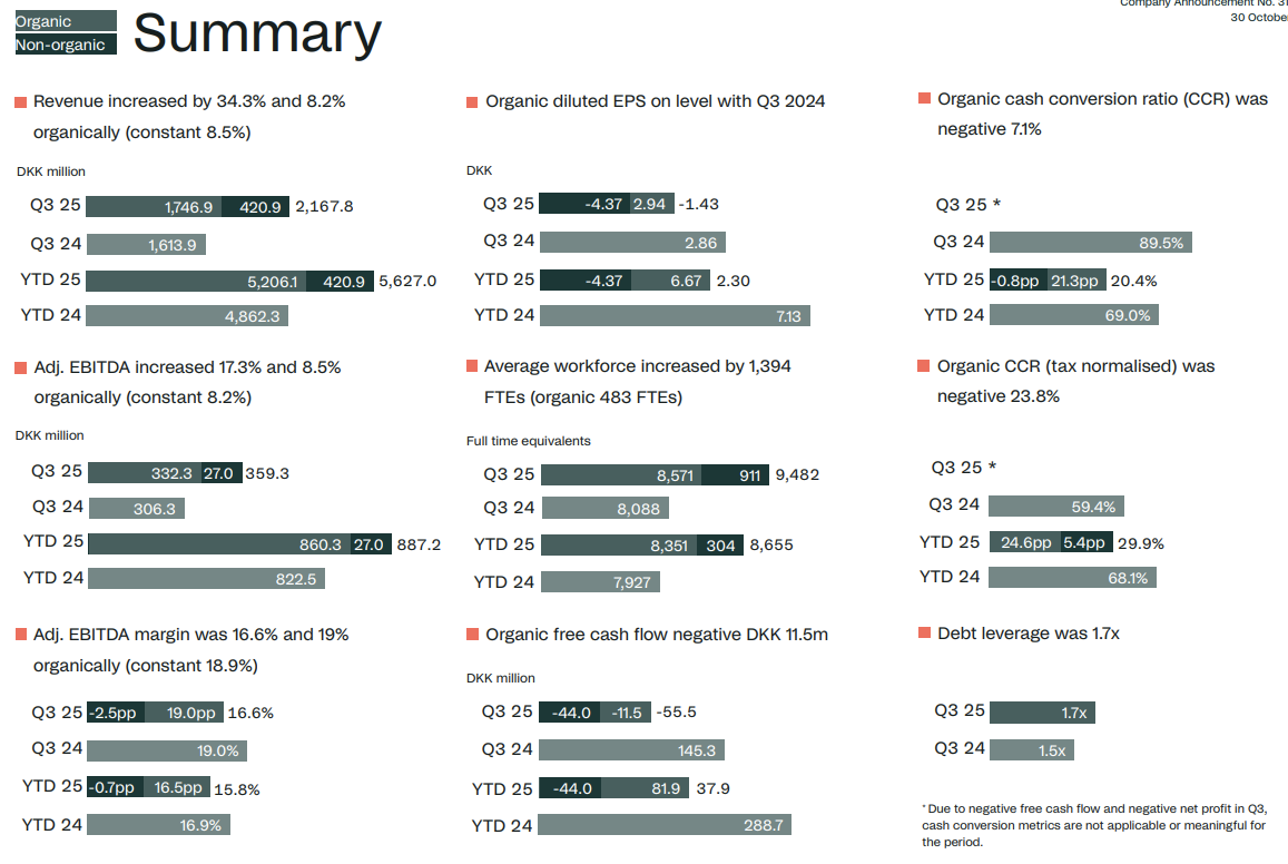 - Netcompanyn orgaaninen liikevaihto kasvoi 8,2 % (valuuttakurssivaihteluista oikaistu 8,5 %) 1 746,9 milj. Tanskan kruunuun vuoden 2025 kolmannella neljänneksellä.