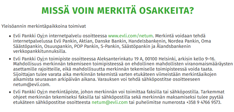Minimimerkintä 700 osaketta, merkintä tehdään https://www.evli.com/fi/netum jonne tunnistaudutaan pankkitunnuksilla ja maksetaan, osakkeet saa sitten suoraan vaikkapa Nordnetin arvo-osuustilille.