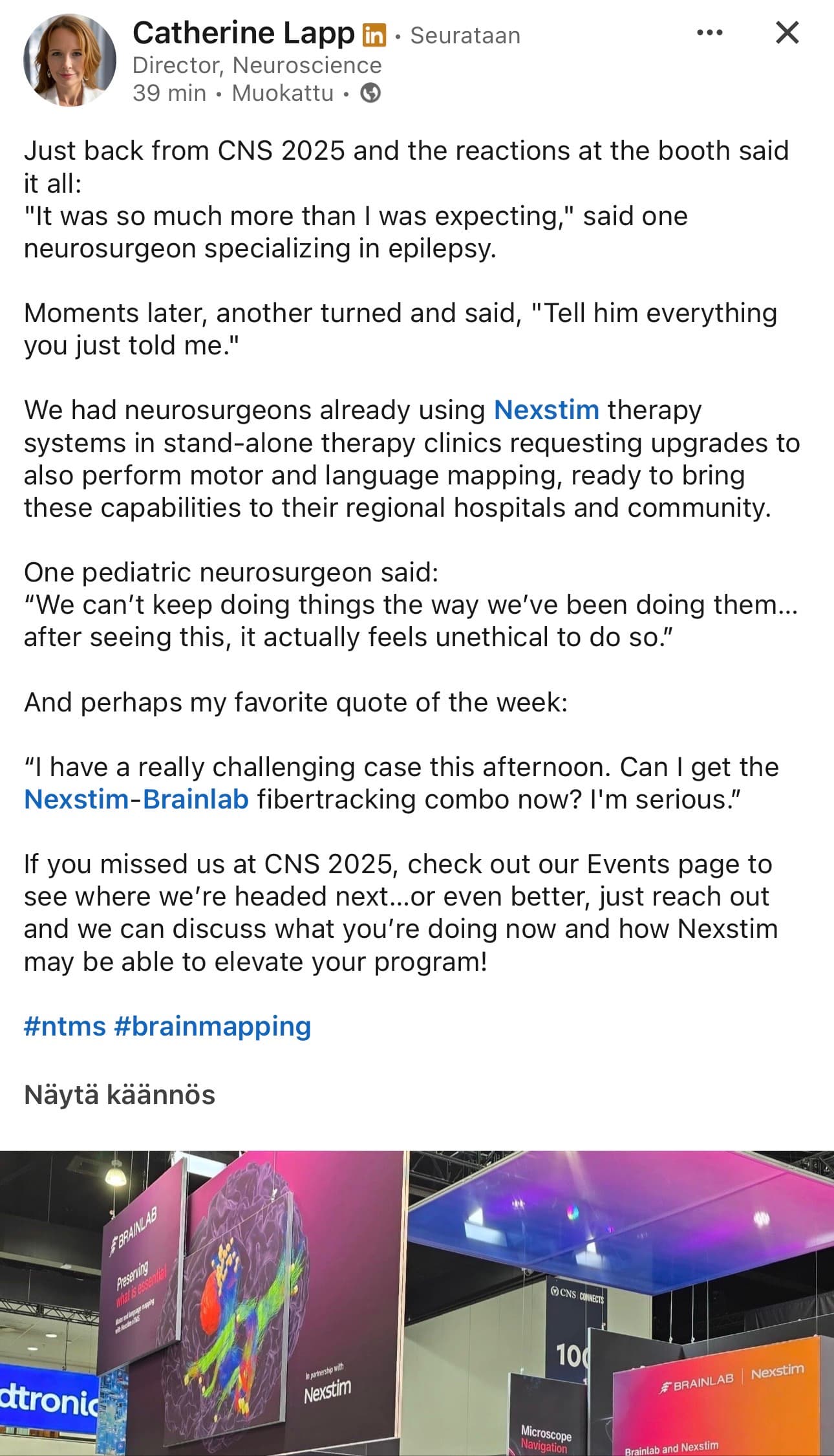 Nexstimin julkaisu linkedinissä. Aika hyvin pähkinänkuoressa laitteiston käyttöä leikkauksen suunnittelussa.