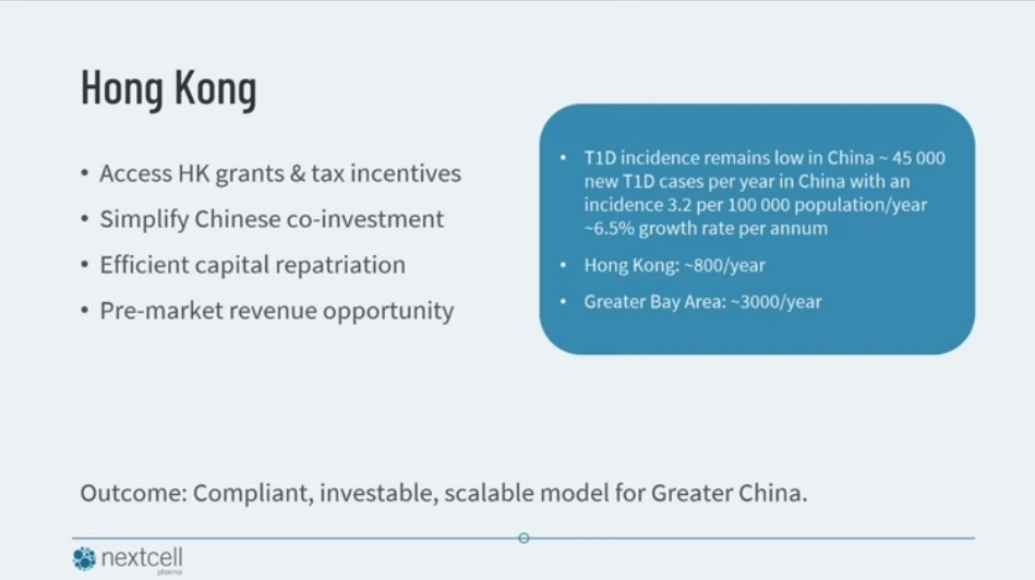Secondary Hypothesis: Nextcell aims to find an Asian partner to establish a local laboratory under a holding company in Hong Kong’s new biotech scene. Locally, they would start Phase 3, which, however, would be significantly lighter, faster, and cheaper than in the West. This would allow them to seek first drug approval through Hong Kong’s recently launched primary evaluation track faster than in Western countries.