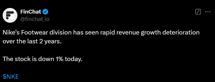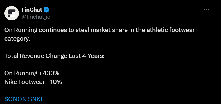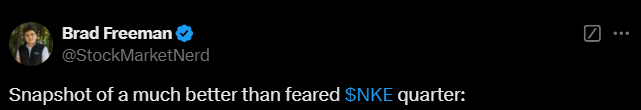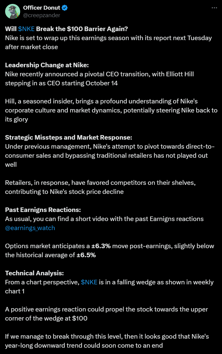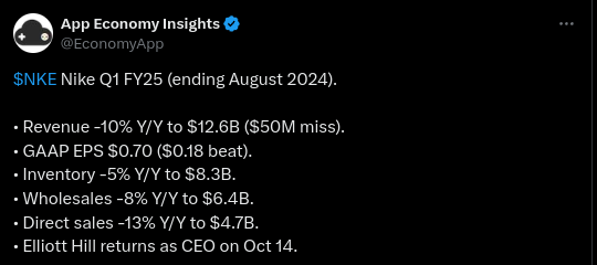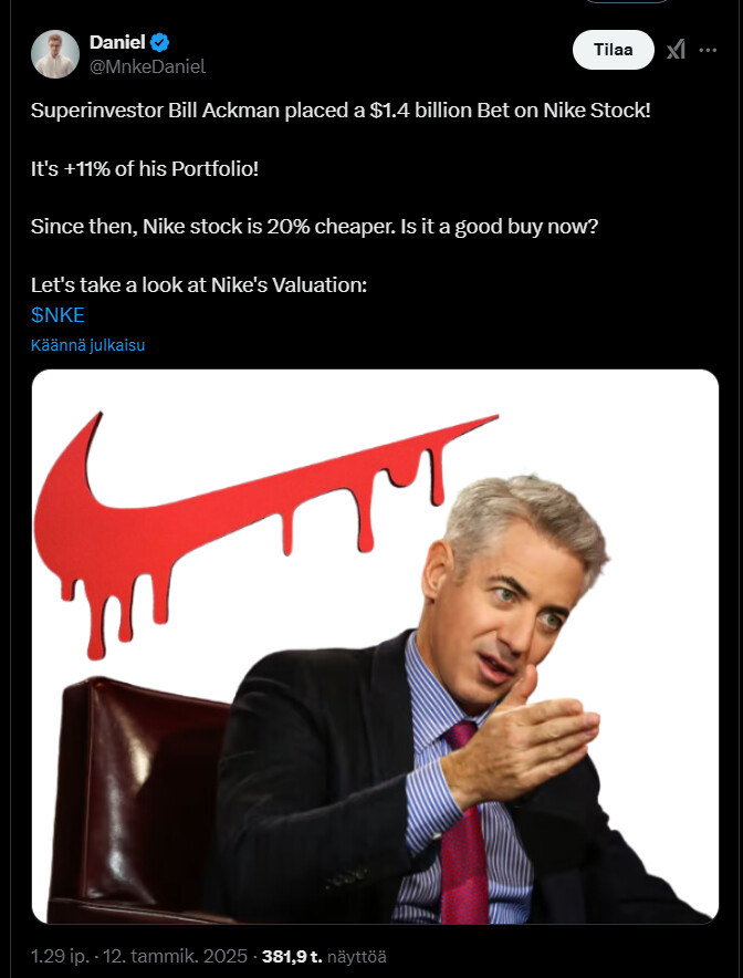 Nike saattaa olla tviitin mukaan kiinnostava osake erityisesti uuden toimitusjohtajan Elliott Hillin nimityksen myötä, joka aloittaa tehtävässään 14. lokakuuta tuo mukanaan vankan tuntemuksen Niken yrityskulttuurista ja markkinatilanteesta. Hänellä on mahdollisuus korjata yhtiön aiemmin tekemiä strategisia virheitä, kuten sen, että yhtiö keskittyi liiaksi suoraan kuluttajamyyntiin, joka vastaavasti heikensi suhteita jälleenmyyjiin.