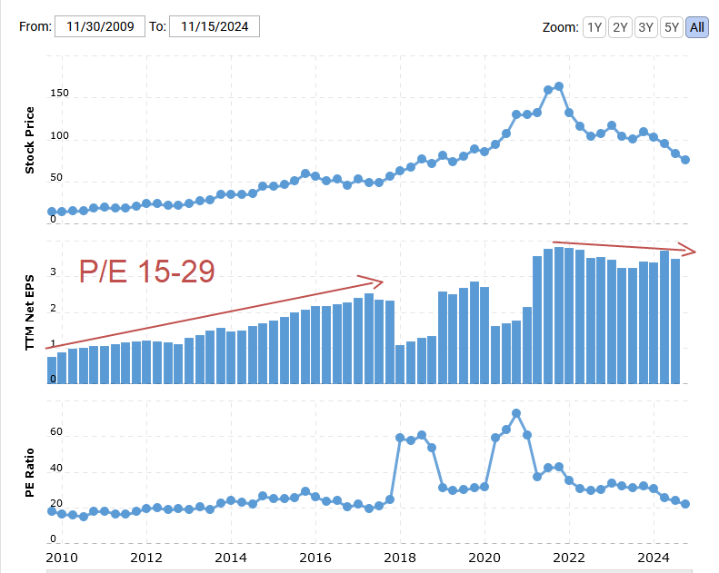 2021-2024 Niken EPS ei ole kasvanut vaan suunta on ollut sivuttain tai ehkä joku voi laskutrendiäkin nähdä. Kun Nikeä kasvufirmana arvostettiin P/E 15-29 niin en usko että markkinat hinnoittelisi Nikeä tuon välin yläpuolelle tai edes yläpäähän. Tulos täytyisi saada selvästi nousemaan että P/E 30 olisi mitenkään järkevä hinta. Itseä voisi Nike kiinnostaa jossain P/E 15-18.