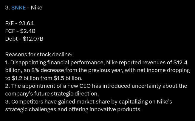 Tässä on nopea katsaus Nikeen. Tviitin asia lyhyesti; osakkeen laskun syitä ovat heikko taloudellinen tulos, uuden toimitusjohtajan tuoma epävarmuus ja kilpailijoiden markkinaosuuksien kasvu. Positiivisia puolia ovat laajentuminen Kiinaan ja Intiaan + vahva kassavirta ja globaali jakeluverkosto.