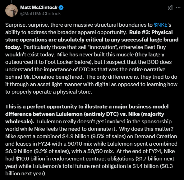 Alla olevan tviitin mukaan Nike tulee vieläkin kohtaamaan merkittäviä rakenteellisia esteitä laajentaessaan vaatekauppaa. Yleisesti ajatellaan, että fyysiset myymälät ovat elintärkeitä suurille brändeille. Nike on perinteisesti ulkoistanut tämän osaamisen Foot Lockerille eikä ole kehittänyt omaa myymäläosaamistaan.