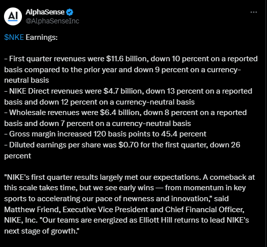 Niken ensimmäisen kvartaalin tulos laski mm. liikevaihdon, Nike Direct -myynnin ja tukkumyynnin osalta, mutta sitten taas bruttomarginaali kasvoi, toisaalta taas osakekohtainen tulos heikkeni merkittävästi.