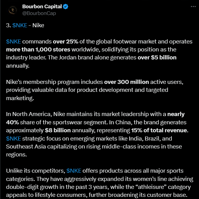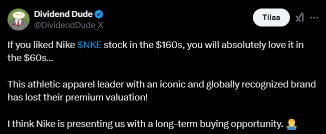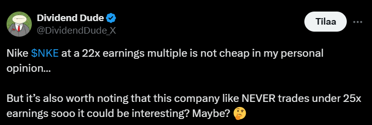 Tviittaja pitää Nikeä aliarvostettuna, lisäksi hän korostaa mm. Jordan-brändin kasvavaa myyntiä sekä Athleisure-kategorian nousua. Hän tuo esille myös, että yhtiö on mukana kasvavilla markkinoilla ja on edelleen innovatiivinen.