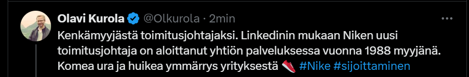 Eilen tuli tällainen uutinen; Elliott Hill on nimitetty Niken uudeksi toimitusjohtajaksi korvaten pitkäaikaisen johtajan John Donahoen.