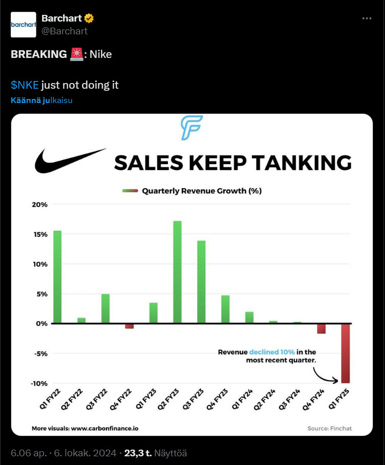 Niken osake on tullut alaspäin ja syystäkin toki, mutta Nike on Nike, joten varmaan aika monet seuraavat tätä yhtiötä sekä odottavat jonkinlaista ryhtiliikettä/käännettä.