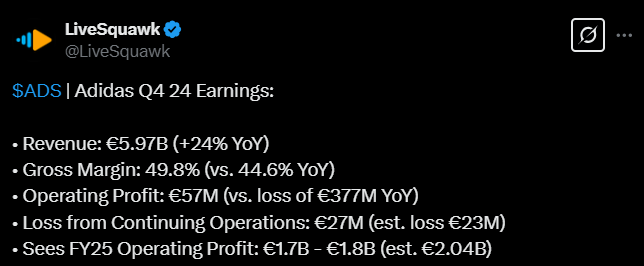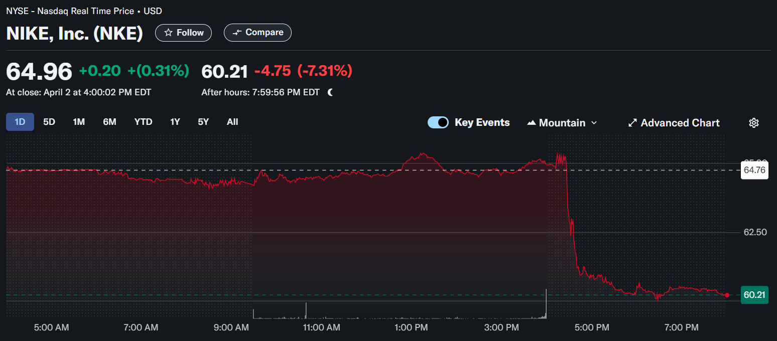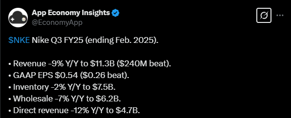 For the fiscal fourth quarter, Nike expects revenue to be down in the low midteens range, in line with the 12% decline analysts had penciled in. Gross margins will be down approximately four to five percentage points. This estimate includes the impacts of newly implemented tariffs from Chinese imports, and reflects the uncertainty in the operating environment, including geopolitical dynamics and declining consumer confidence.
