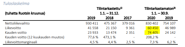 När man tittar på årets resultaträkning ser man att nettoresultatet under perioden 1.1-30.9.2020 har varit betydligt högre än rörelseresultatet. I praktiken måste detta förklaras av finansiella intäkter, men har någon hittat orsaken till detta?