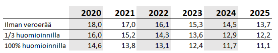 Olika P/E-tal har kastats runt beroende på hur mycket av skatteskillnaden som tas i beaktning. Här är det, skissat med @kabu:s alternativ, hur P/E-talet skulle utvecklas om resultatet växer i den antagna marknadstakten på 5,6 % CAGR.