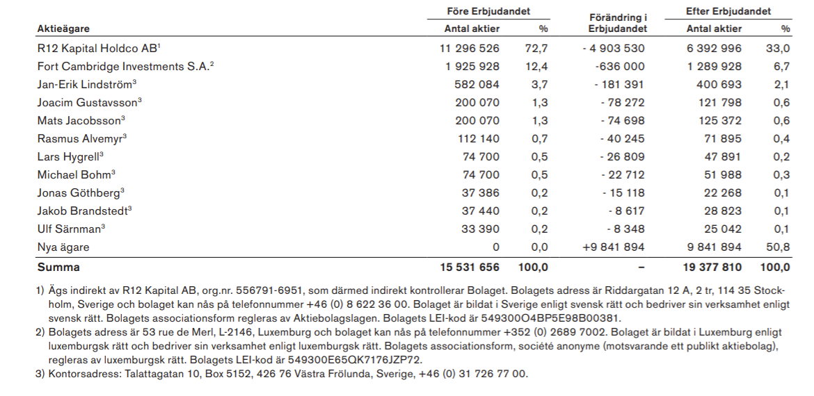 “Börsintroduktionen omfattar högst 8 558 169 aktier, varav 3 846 154 är nya aktier i Bolaget. Resterande 4 712 015 aktier är befintliga aktier som erbjuds av Bolagets aktieägare.”