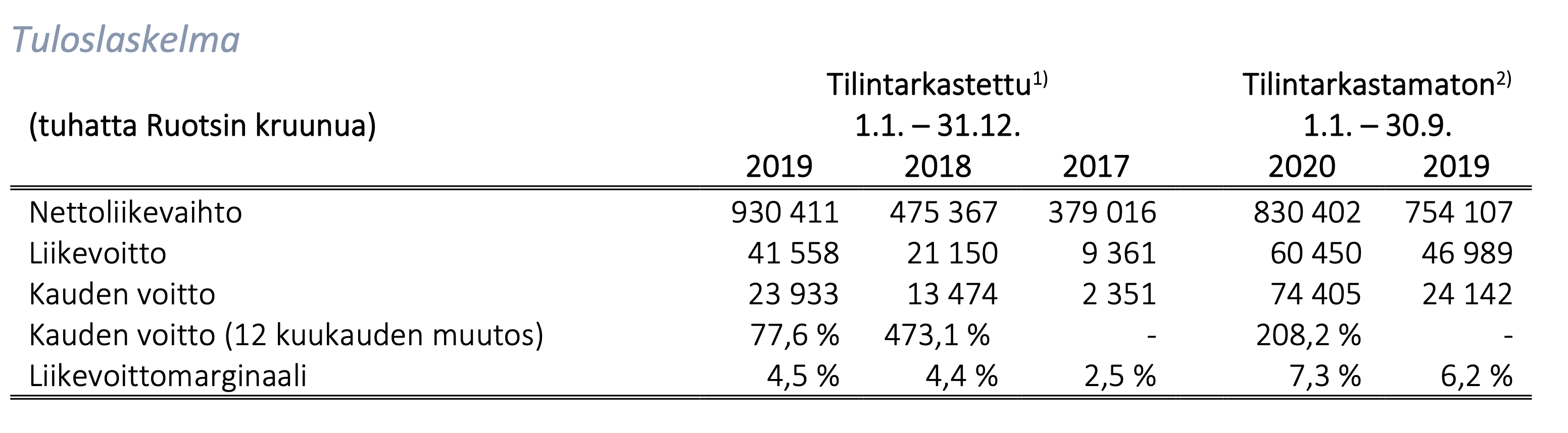Generellt sett verkar det utifrån siffrorna som att företaget har fått en extra boost i verksamheten från coronapandemin, då människor har haft mer fritid. Dessutom måste försäljnings- och rörelseresultatökningen under 2018–2019 återspegla de tidigare nämnda företagsförvärven. Q4 verkar vanligtvis ha förlust på rörelseresultatraden; åtminstone 2019 var det så, eftersom Q1-Q3 2019:s rörelseresultat var större än hela 2019 års rörelseresultat. Om man extrapolerade 2020 års rörelseresultat baserat på 2019 års utfall, kunde det vara 41,56/46,99*60,45 = 53,46 MSEK. Då skulle 2020 års post-money P/rörelseresultat (observera, inte P/E) vara i storleksordningen 18x.