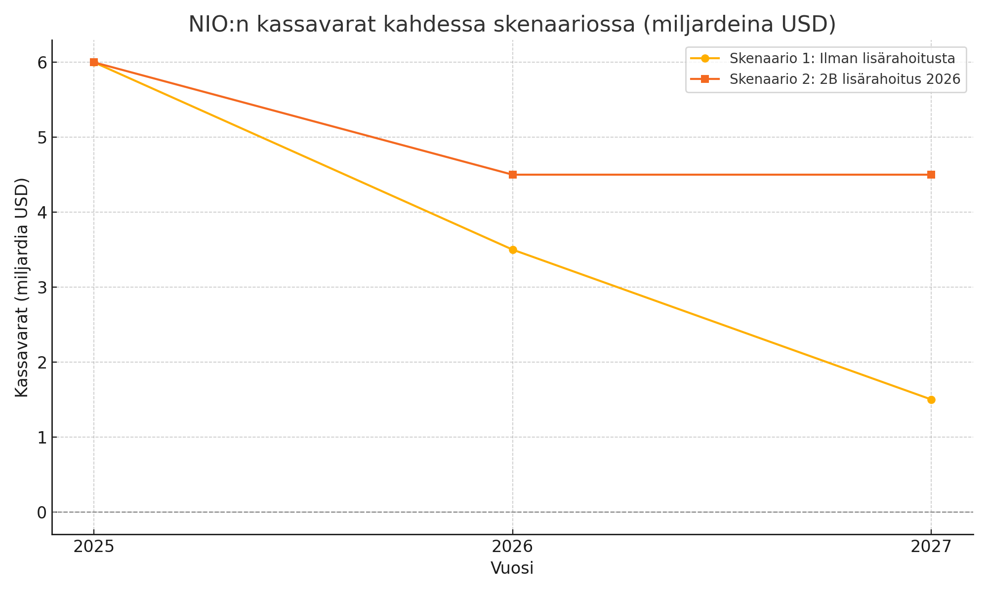 NIO Inc. on kiinalainen sähköautovalmistaja, joka kamppailee kasvun ja kannattavuuden tasapainon kanssa. Yhtiön kassatilanne ja kyky rahoittaa toimintaansa ovat keskeisiä tekijöitä sen tulevaisuuden kannalta. Alla kaksi realistista skenaariota NIO:n kassavirran kehittymisestä vuoteen 2027 asti.