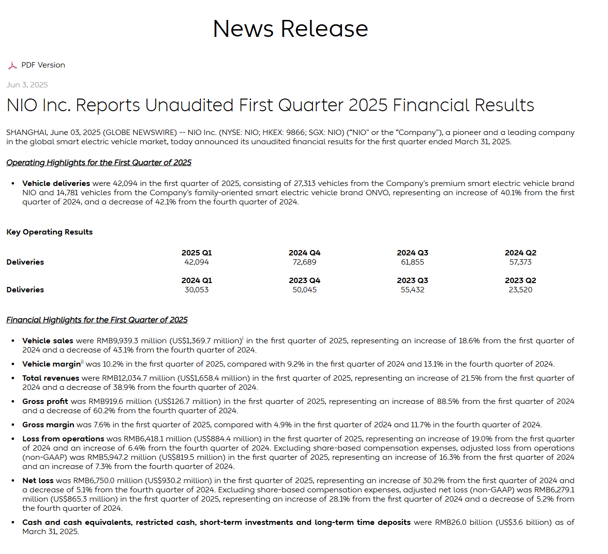 Ensinnäkin Nion taloudellinen tilanne ei ole vastannut odotuksia. Vaikka heidän tulonsa vuonna 2024 olivat 9 miljardia dollaria (65,7 miljardia RMB) ja he toimittivat 221 970 ajoneuvoa (viimeisimmän raportin mukaan 21. maaliskuuta 2025), he raportoivat edelleen suuria tappioita – arviolta 3,4 miljardia dollaria koko vuodelta 2024. Se on parannus aiempiin vuosiin verrattuna, mutta ei riitä vakuuttamaan sijoittajia tai mediaa nopeasta käänteestä. Verrattuna kilpailijoihin, kuten Xpengiin, joka on pienentänyt tappioitaan nopeammin, tai BYD:hen, joka on jo kannattava, Nio vaikuttaa vähemmän tehokkaalta, mikä on laimentanut innostusta.