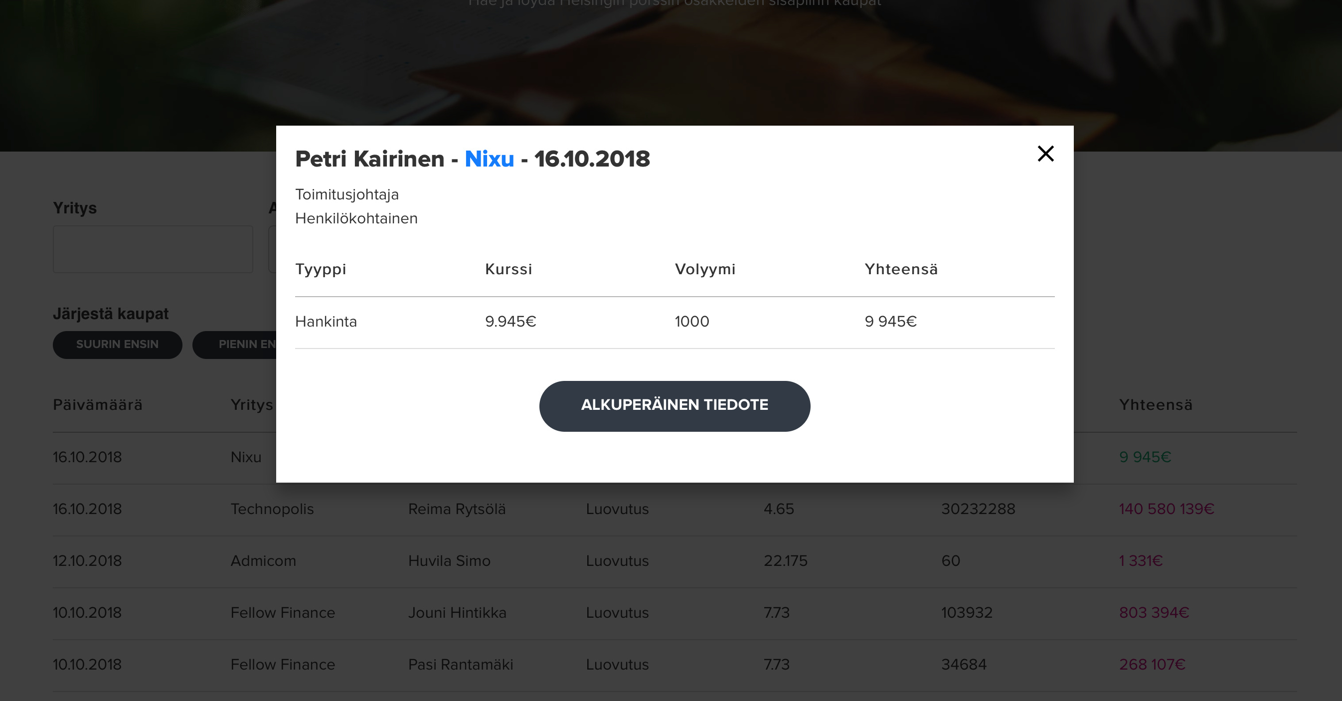 Huomasin että Nixun toimitusjohtaja Petri Kairinen oli ostanut noin 10 000€ verran Nixua juuri ennen tulosjulkistusperiodia. Mitä mieltä olette? Oisko signaali? Sisäpiirin kaupoista katsoin.