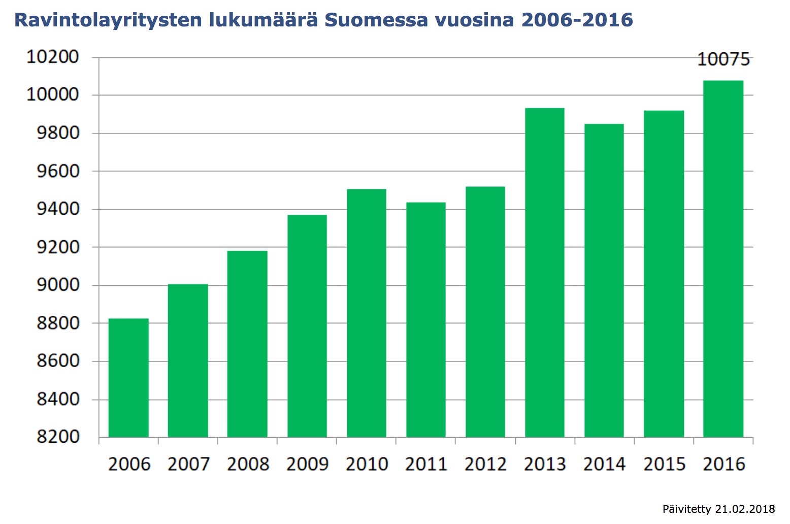 Talouden vaisusta suhdanteesta huolimatta ravintola-ala on pysynyt viime vuodet kasvussa. Talouden piristyminen vuoden 2016 aikana on heijastunut selvästi myös ravintola-alaan ja liikevaihto on kasvanut ensimmäisen yhdeksän kuukauden aikana 5,3 %:lla."