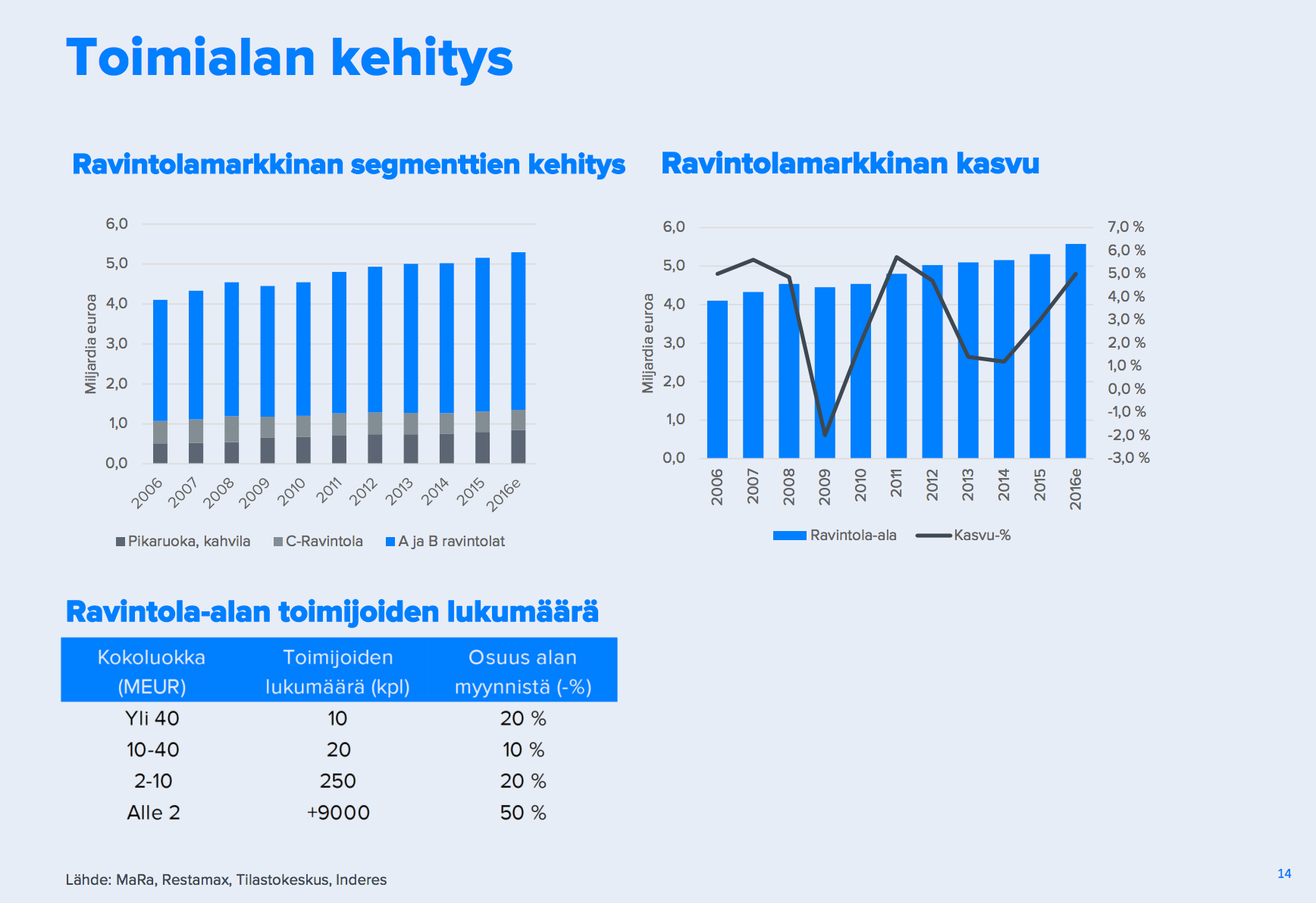 "Ravintola-ala on kasvanut Suomessa vuosien 2006-2016 aikana keskimäärin hieman yli 3 % vuodessa. Kasvu on ollut selvästi bruttokansantuotteen kasvua nopeampaa johtuen ravintola-alan keskeisistä trendeistä (seuraava kappale). Kasvun ajureina ovat olleet pikaruokaravintolat & kahvilat sekä A&B segmentin ravintolat. Ravintola-alan myynti laski vuoden 2009 taantumassa ainoastaan 2 % ja ala toipui kriisistä erittäin nopeasti. Tämä on mielestämme hyvä osoitus alan defensiivisyydestä ja alla olevista kasvutrendeistä.