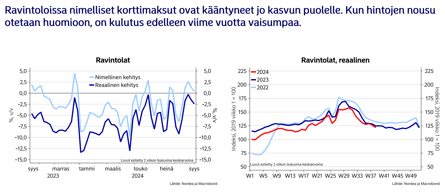 If I recall correctly, the World Championships brought in about EUR 5 million in revenue during the comparison period, and assuming it came with a 20% EBITDA margin (the earnings impact was ~EUR 1 million), the adjusted operating margin for Q2’23 would have been in the 10.5–11% range. Weather certainly has some effect, but based on card data, the market has been crawling near zero or below it during 2024. In 2023, the restaurant market was still growing in Q1-Q3 and only turned downward in Q4.