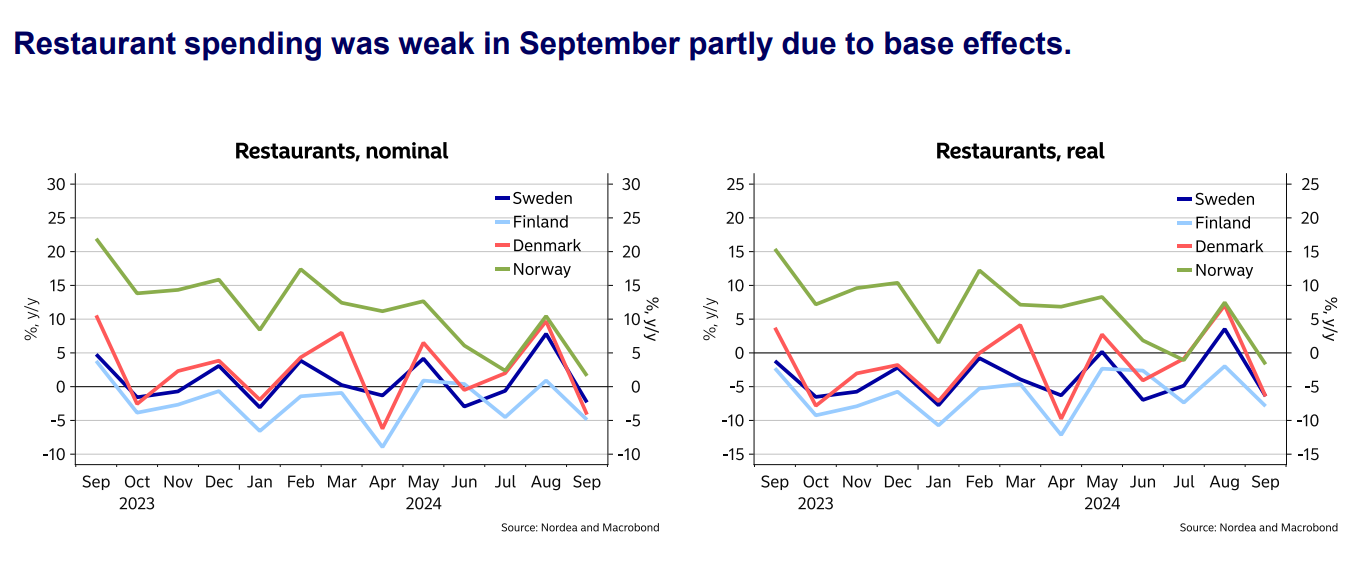 Nordea card data from September. Consumers apparently still can’t decide whether to increase or decrease restaurant visits, given how varied the development has been. In the big picture, we are still in negative territory.