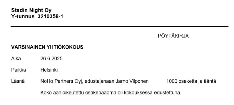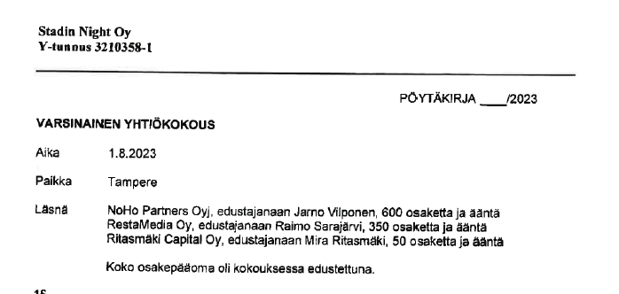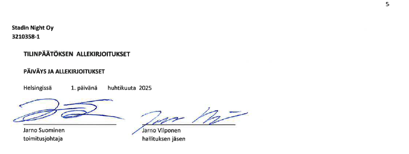 Stadin Night Oy:n vuoden 2023 tilinpäätös on toimitettu kaupparekisteriin reippaasti myöhässä, kuten myöskin allekirjoitettu myöhässä: