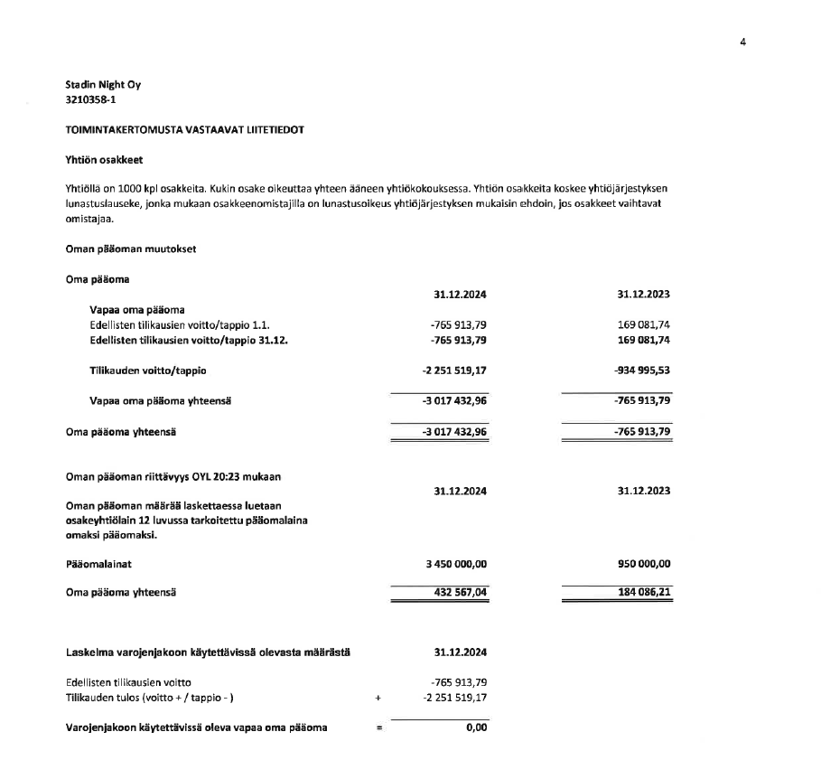 Tätä ennen Stadin Night ehti tehdä hurjat tappiot ja NoHo on antanut kaikkiaan 3 450 000€ pääomalainaa yhtiölle vuoden 2024 loppuun mennessä: