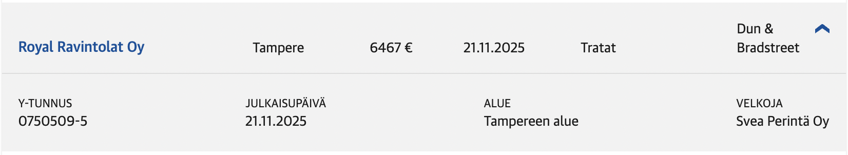 Jo toinen tratta tytäryhtiöllä. Kirjanpidollisesti Royal Ravintolat Oy on tehnyt hyvää tulosta, mutta laskut jää maksamatta. Tästä on paljon huhua että NoHo ei ole rahaa maksaa tällä hetkellä laskuja.