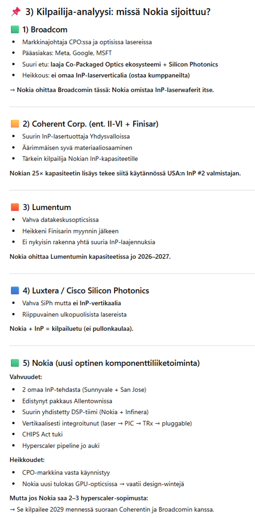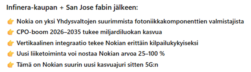 En ole vielä ääneen halunnut kertoa kun tosiaan uutta liiketoimintaa ja vielä näytöt puuttuvat. Mutta ehkäpä voin avata sellaista mahdollista polkua myönteisessä skenaariossa mitä olen tarkastellut ja raapustanut ylös muistiinpanoihin. Mutta vaatisi sen että Nokia osaa luoda tiensä yhtenä keskeisenä voittajana ulos, ja sen että CPO tulee käyttöön oikeastaan kaikessa mahdollisessa.