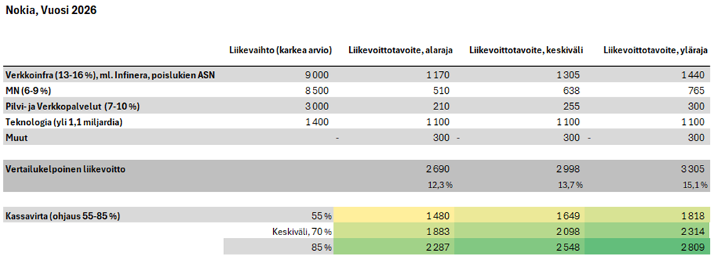 Toistetaan vielä kerran että tavoitteet on tavoitteita - ja ottaisin hyvin tyytyväisenä vastaan sen mikäli Nokia yltäisi vuonna 2026 tuollaiseen 13,7 %:n (ehkäpä kuitenkin epärealistista) - nykyisten tavoitteiden keskivälin mukaiseen - oikaistuun liikevoittoon. Alarajaan (12,3 %) yltäminen olisi suorituksena tasoa ok, mutta se jäisi tavoitellun yli 13 %:n tavoitetason alle. Voi toki olla että liiketoiminnassa tapahtuneet muutokset laittavat vielä näitä tavoitteita uusiksi - ja toisin kuin mitä itse olen tehnyt - ei Nokia voi vielä esimerkiksi Infineran ostoa sisällyttää tavoitelukemiin.