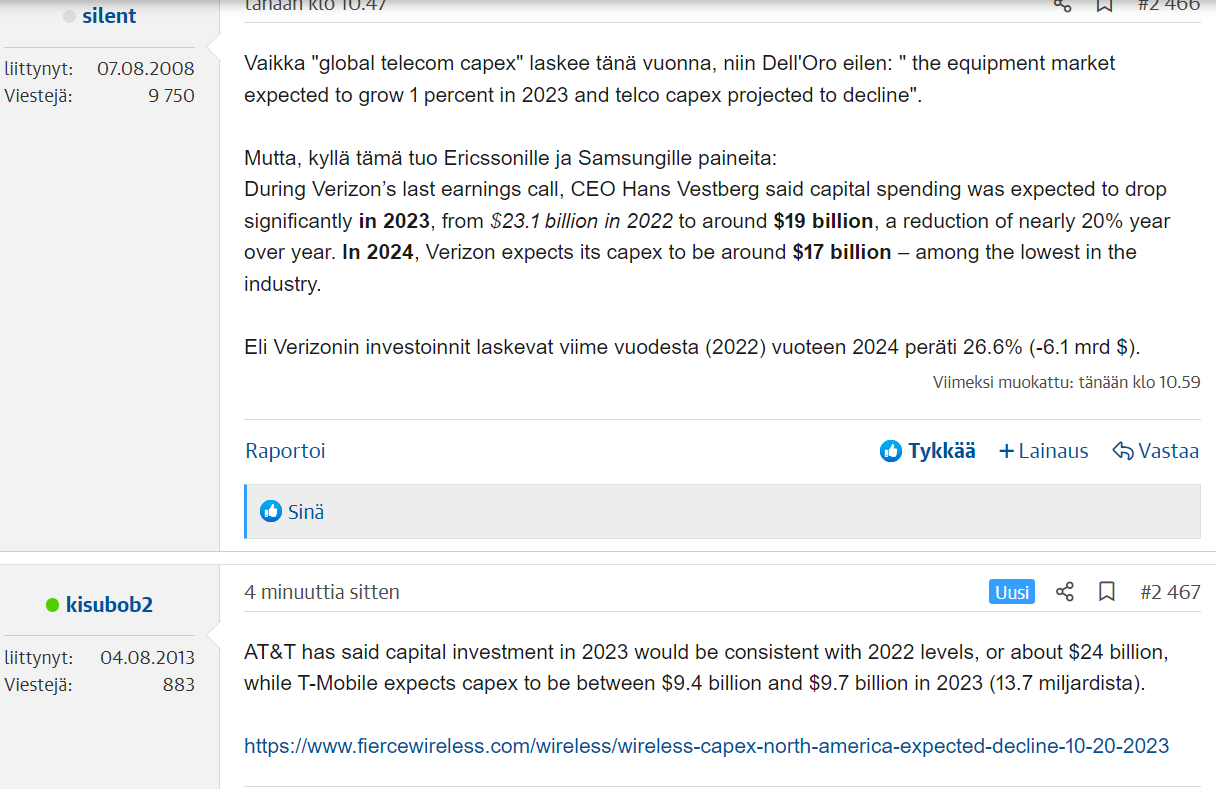 Edit: Verizon muistaakseni laski erikseen c-band investoinnin - olikohan se tuossa 23,1 vertailulukemassa mukana? Luultavasti on. AT&T jatkaa nykyisellä tahdilla vielä jonkin aikaa eteenpäin ja muilla investoinnit laskee. Tämä on se asia jota useat USA -keskeiset analyysitahot tuijottavat. Kiinteän verkon rakentaminen ei luultavasti ota yhtä paljoa takapakkia. 1+1, Ericsson kärsii tilanteesta Nokiaa enemmän.