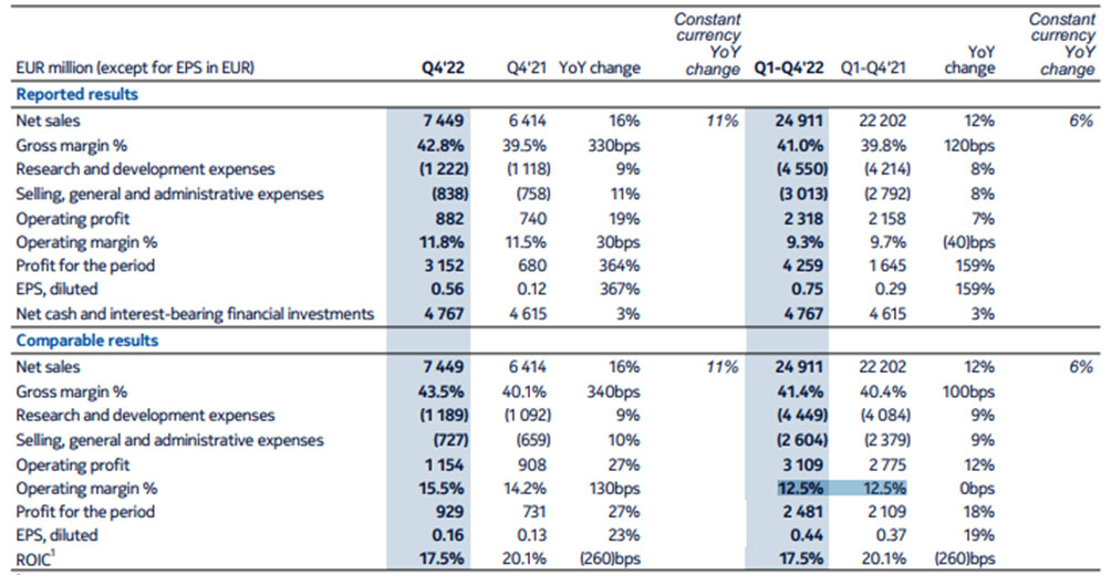 miljoonissa euroissa, SEK=0,0941, 31.12.2022, suluissa Nokian luvut