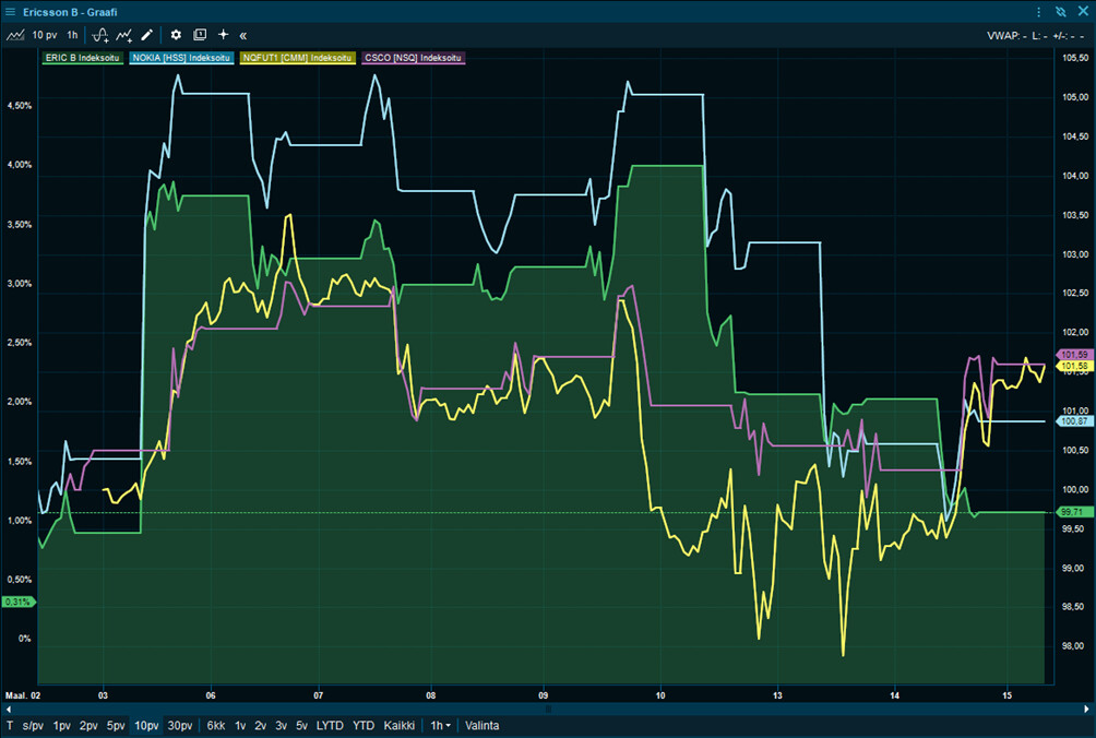 Viimeiset 10 päivää, käytännössä samat tuotot Nokia, Nasdaq, Cisco ja Ericsson. Viimeisen 30 päivän aikana Nokian tuotto 2,5 % parempi kuin Nasdaqin. Korrelaatio yleisesti sektoriin ollut vahva. Mutta samaa mieltä että matalalla kyntää, kuten myös Ericsson.