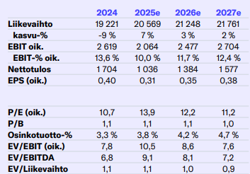 Nokian osakkeen oikaistut tuloskertoimet (2025e-2026e EV/EBIT 10,5-9x) eivät ole erityisen vaativia, mutta kassavirtapohjaisesti (EV/FCF 17x-14x) arvostus on jo huomattavasti korkeampi. Myös osien summa -laskelmamme ja DCF-mallin valossa nousuvara on perusskenaariossa lyhyellä tähtäimellä rajallinen. Infinera-yritysosto sekä uudet mahdollisuudet datakeskuksissa tarjoavat keskipitkällä aikavälillä Nokialle tuloskasvupotentiaalia, mikä onnistuessaan olisi positiivinen ajuri osakkeelle. Myös Matkapuhelinverkkojen ennusteitamme voimakkaampi tuloskäänne tukisi osaketta. Näiden positiivisten ajurien rinnalle tullit ja mahdollinen kauppasodan eskaloituminen ovat tuoneet merkittäviä epävarmuustekijöitä, ja kokonaisuutena riski-tuottosuhde on mielestämme nykyarvostuksella neutraali.