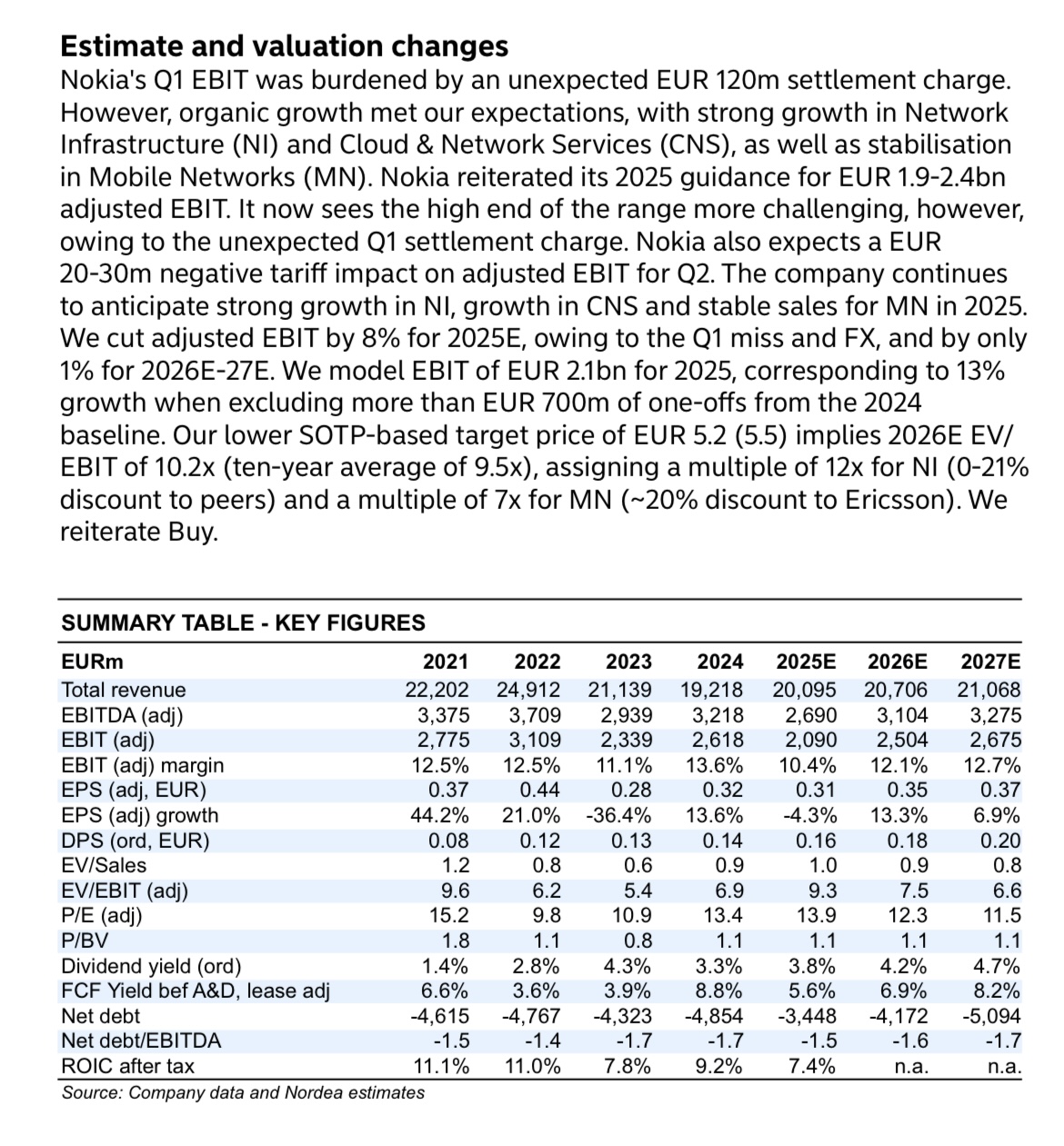 Nokia ohjeistaa edelleen vuodelle 2025 vertailukelpoisen liikevoiton asettuvan 1,9-2,4 miljardin euron haarukkaan ja tästä lohkeavan 50-80 % vapaata kassavirtaa. Yhtiö odottaa edelleen vahvaa liikevaihdon kasvua Verkkoinfrastruktuurissa, kasvua Pilvi- ja verkkopalveluissa sekä pääosin vakaata liikevaihtoa Matkapuhelinverkoissa. Teknologia-yksikön odotetaan tekevän noin 1,1 miljardia euroa liikevoittoa. Nokia arvioi Yhdysvaltojen tullien aiheuttavan noin 20-30 MEUR:n negatiivisen vaikutuksen Q2:n tulokseen, mutta heikon ennustettavuuden vuoksi H2:n osalta oletuksia ei ole vielä tehty. Tämän pohjalta arvioituna Nokia selviäisi tullisekoilusta melko pienillä vahingoilla. Nokia kommentoi Matkapuhelinverkkojen Q1:n kertakulun sekä loppuvuodesta lisättävien kasvuinvestointien vuoksi nykyisen ohjeistushaarukan ylälaidan saavuttamisen olevan aiempaa haastavampaa. Kokonaisuutena Nokian näkymät tarkoittavat merkittävää operatiivista parannusta verkkoliiketoiminnoissa, sillä viime vuoden tulos sai tukea yli 700 MEUR:n kertaluonteisista eristä. Q1-raportin pohjalta kuluvan vuoden vertailukelpoisen liiketuloksen ennusteemme laski 7 % ja on nyt pyöristettynä 2,1 miljardia euroa. Tulosennusteen lasku selittyy pitkälti Q1:llä nähdyllä tulosalituksella.