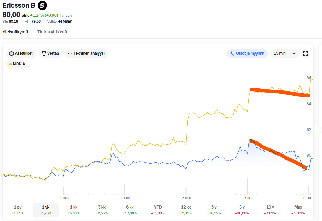 Jep, katsoin samaa että osake sai eilen siipeensä Nysessä. Myös Nokia oli pitkään miinuksella, mutta punnersi ennen päätöstä plussalle. Sektorilla monet saivat eilen siipeensä: Marvell, Qualcomm ja jopa AMD ja jne.. Tämä hieman haiskahtaa vähintään tuottojen kotiutukselta (ja kenties jotain muuta), mutta hämmentävän hyvin osake on toipunut tänään. Btw. viikossa Nokia on nyt tuottanut +9,5 %, kun Ericsson +2,0 % - eli hieman erilailla ovat nyt menneet. Mielestäni Ericsson tulee nyt kärsimään siitä että heidän portfolio rajoittuu langattomiin verkkoihin. Seuraavan vaiheen AI huumaa katsovat pääosin sivusta kun data centereitä varustellaan. Samaan aikaan kun Nokian jenkkivolyymi on ollut selkeässä nousussa, ei samaa ole voinut havaita Ericssonin jenkkiversion suhteen.