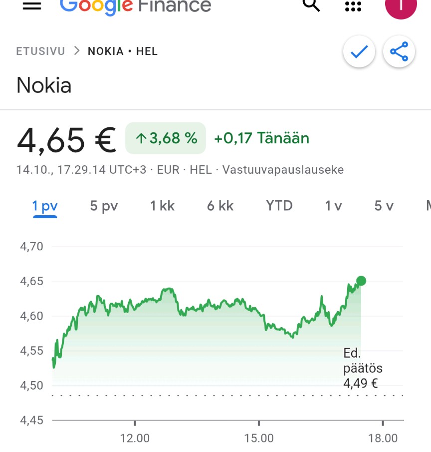 Hej Sinuhe 1, din vurdering af prisen på 4€ er nok tæt på sandheden i lyset af tallene. Analytikerne gætter vist på en lidt højere værdi. Jeg synes, at nogen ved lidt mere om Nokia, når prisen er hoppet så meget op, og der har været stor omsætning i USA. I 2012 havde jeg af en eller anden grund mange Nokia-aktier tilbage i porteføljen, da prisen faldt drastisk. I Kauppalehti blev det sagt, at det kun var et spørgsmål om uger, før Nokia ville gå konkurs. Jeg var virkelig ked af denne situation og tog en all-in beslutning, solgte alle mine andre aktier, undtagen Fortum, og købte Nokia for de penge. I september 2013 vågnede jeg en morgen og læste på nettet, at Nokia havde solgt sin telefonforretning til Microsoft. Aktiekursen sprang i vejret, og jeg var igen med i spillet og fik endda en lille fortjeneste. Det er utroligt, hvor meget Nokia er steget nu.