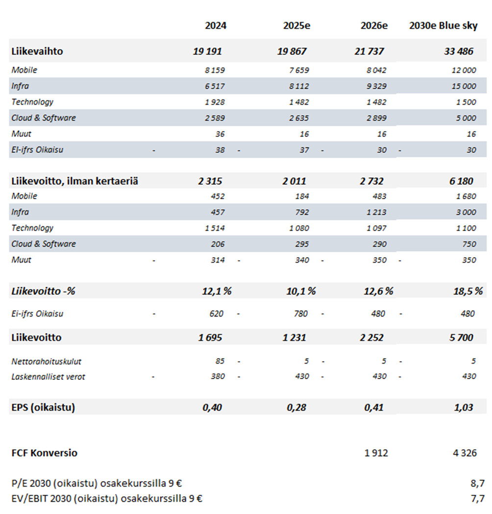 Jag gjorde tidigare, innan affärsnyheterna, beräkningar där jag förväntade mig en omsättning på 21,7 miljarder euro för Nokia redan år 2026. Och då främst till följd av den starka tillväxten inom optiska och IP-nätverk. Marknaden tycktes förvänta sig ungefär denna omsättning för år 2028.