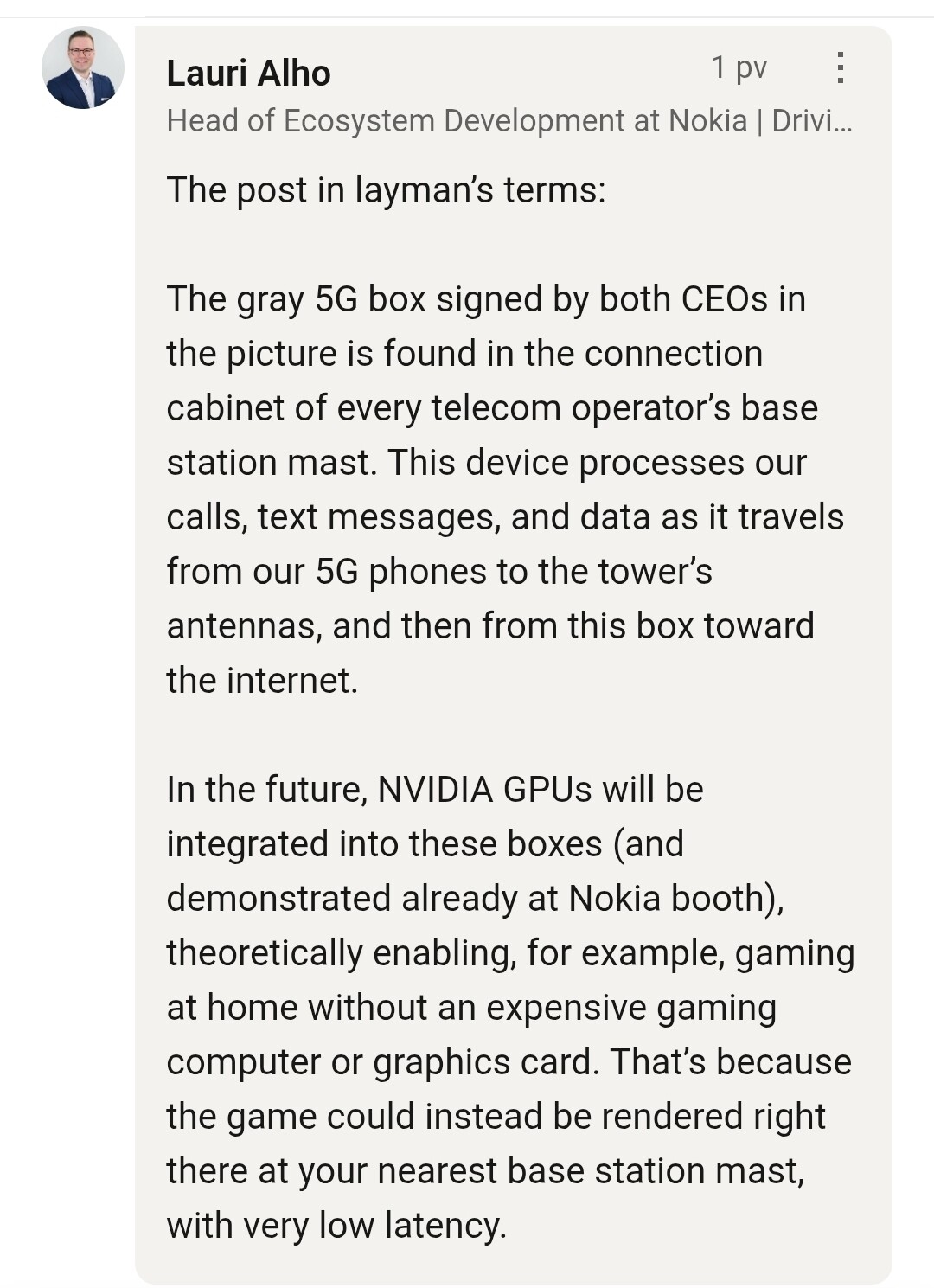 Edit: hyvä Linkedin postaus eli Nokia tuo myös radion missä Nvidian GPU itsessään.