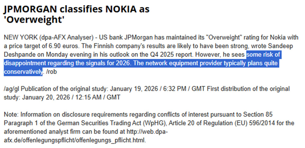 JPM oförändrad, rapporten uppdaterades igår kväll. Köp och 6,90 €. Jag delar dock den risk som nämns nedan – om Nokia återigen tenderar att vara ”överkonservativa” kan det bli en besvikelse för marknaden.