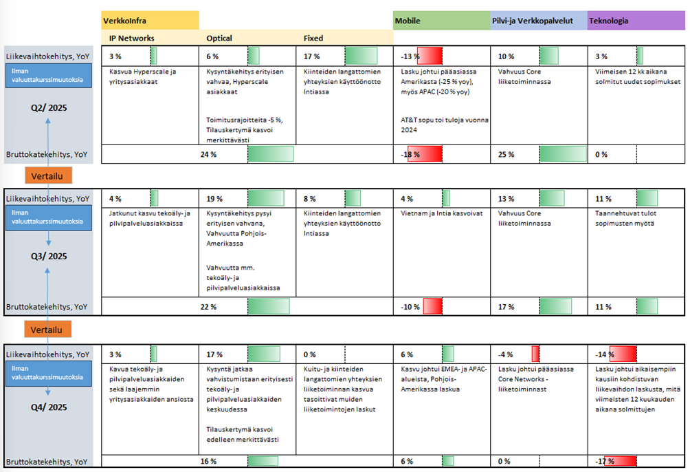 Optiset verkot jatkaa hyvää kehitystä, IP ei ole oikein tullut läpi. Hyvää myös että vihdoin mobilen bruttokehitys myönteistä. Patentit laskivat reilusti sillä vuosi sitten paljon taannehtuvia tuloja.